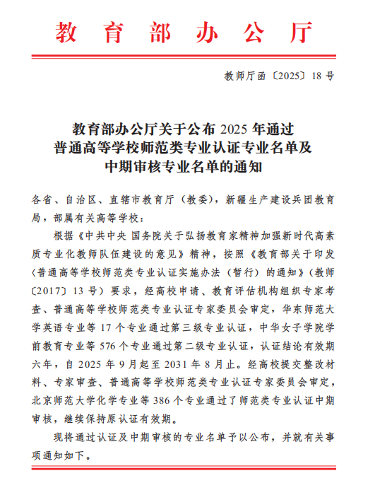 近日,教育部办公厅公布了《关于2025年通过普通高等学校师范类专业认证专业名单及中期审核专业名单的通知》(教师厅函〔2025〕18号),我校特殊教育专业和学前教育专业通过师范类专业第二级认证,认证有效期为六年(2025年9月至2031年8月)。